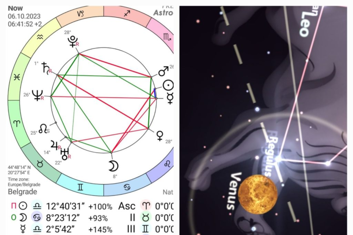 Moj omiljeni dan je svanuo u 06:41:52 sa Suncem na 12°Vage.Venera je u znaku Lava, u recepciji sa Suncem.Jedno drugo podržavaju.Venera je planeta ljubavi, lepote i harmonije, dok je Lav vatreni znak koji se često povezuje sa strašću, samopouzdanjem i ekstravagancijom. Kada je Venera u znaku Lava, energija ljubavi postaje strastvena, izražajna i sklonija dramatičnim izlivima emocija.Dispozitor Venere je Sunce u Vagi, oni su u recepciji.Vaga je znak balansa, pravde i harmonije. Ovaj položaj Sunca naglašava potrebu za ravnotežom i pravičnošću u ljubavnim odnosima i međuljudskim interakcijama. Ovo bi mogao biti dan kada su izražavanje ljubavi, umetnost, kreativnost i društvene interakcije posebno naglašeni. Ljudi mogu biti skloni ispoljavanju svojih emocija otvorenije nego obično, a takođe će težiti ravnoteži i harmoniji u odnosima. Energija ovog dana može podsticati kreativnost i umetnički izraz. Ljudi se mogu osećati inspirisanim da izraze svoju strast kroz umetnost, muziku ili druge oblike kreativne aktivnosti.Na ličnom nivou, ovaj dan može doneti pažnju prema ljubavnim odnosima i partnerstvima. Ljudi mogu biti više skloni da izraze svoju ljubav i naklonost prema voljenim osobama, ali takođe mogu očekivati reciprocitet i pažnju.Venera je u Lavu i pravi aspekt od 150° sa Plutonom.Ovo je ključna energija današnjeg dana.Aspekt od 150°između Venere u Lavu i Plutona iz Jarca predstavlja kvinkunks, što je aspekt koji nosi određeni izazov i dinamiku između ovih planeta, vrlo često nosi energiju prilagođavanja.Prilagođavanje ide kroz transformaciju kroz odnose: Pluton je planeta transformacije,dubokih promena i regeneracije.Kvinkunks aspekt često nosi sa sobom element iznenađenja i nečega što se dešava ispod površine. Ova dinamika može izazvati neočekivane promene ili potrebu za dubokim introspekcijama kada je reč o ljubavnim odnosima i vrednostima.Budite danas u miru jer pozicija Meseca u Raku je u napetom aspektu sa Suncem što dodatno podiže emotivnu osetljivost.Sukob između strasti i promene: Venera u Lavu teži strastvenim i dramatičnim izlivima ljubavi, dok Pluton donosi potrebu za promenom i regeneracijom. Ovaj aspekt može stvoriti unutrašnji sukob između želje za strašću i potrebom za transformacijom u ljubavnim odnosima.Iako ovaj aspekt može doneti izazove, takođe ima potencijal da omogući duboku transformaciju u ljubavnim odnosima. To može uključivati oslobađanje starih obrazaca ponašanja ili prepoznavanje dubokih unutrašnjih potreba i želja.