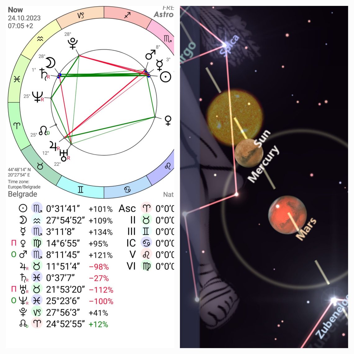 Utorak,24.10.2023,Marsov dan je svanuo u 07:05:00 sa Suncem na 0°30’Škorpiona.Energija se iz one diplomatične formalne Vage sva preselila u fokusiranu intenzivnu Škorpiu i nekim ljudima već od toga nije dobro? Ali to je potpuno prirodni ciklus, ništa spektakularno.Međutim energija Škorpiona nema zaobilaznice,izgovore ide direktno u metu.Kao da su kapaciteti kolektivne svesti prepunjeni strahovima realnosti i nemaju toleranciju čak ni na prirodno pospremanje,čiščenje organa,orgaizma i okruzenja.Da li ste čuli za izraz “cirkardijalni ritam”