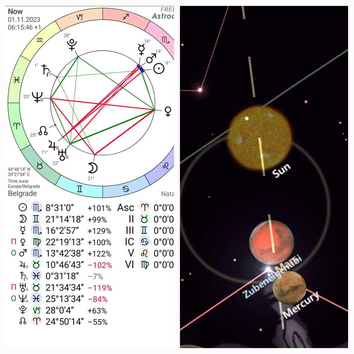 Sreda,1.novembar 2023,Merkurov dan je svanuo u 06:15:46 sa Suncem na 8°Škorpiona.Vladar današnjeg dana Merkur je takođe u Škorpionu.