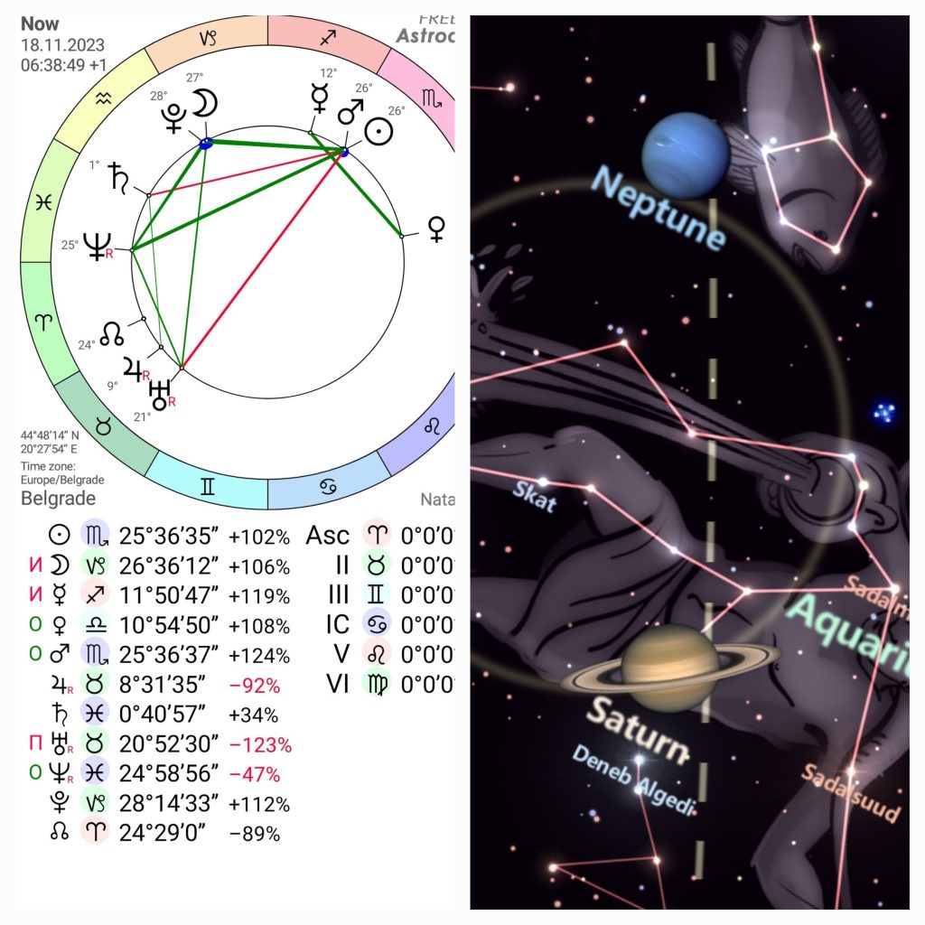 Subota 18.11.2023,Saturnov dan je svanuo u 06:38:49 sa Suncem na 25°Škorpiona.Vladar današnjeg dana Saturn je na 0°Riba.Vrlo je zanimljiva ova danas priča o Saturnu.Znači Saturn je svom retrogradnom hodu vratio se na 0°Riba još 12.10.Onda je 4.11.okrenuo u direktan hod takođe sa 0°Riba i danas je tu.Od 28.11.se lagano kreće napred,vrlo sporo.Tek u januaru će da krene u svom ritmu.Primetite pre svega simboliku samog Saturna u znaku Riba;često ukazuje na izazove i lekcije vezane za suptilne dimenzije života,na naše duboke podsvesne sadržaje.Takođe to je usvojeni stari obrazac ili uverenje u našem genetskom nasleđu. Baš zbog toga čovek može imati duboku emocionalnu osetljivost i tražiti odgovore u paralelnim realnostima ili težiti duhovnom razvoju. Ovo može dovesti do unutrašnjih sukoba između stvarnosti i maštanja.Na kolektivnom planu ovo je period kada društvo prolazi kroz proces samospoznaje i traženja višeg značenja u kolektivnom iskustvu.Ovo su sve vrlo komplikovani procesi kada počnemo “muljati” Svi su krivi za sve! Ljudi moji to nije tema,ne gubite vreme,nerve, strpljenje na traženju krivaca ili pitanju ;zašto se to nešto dešava.