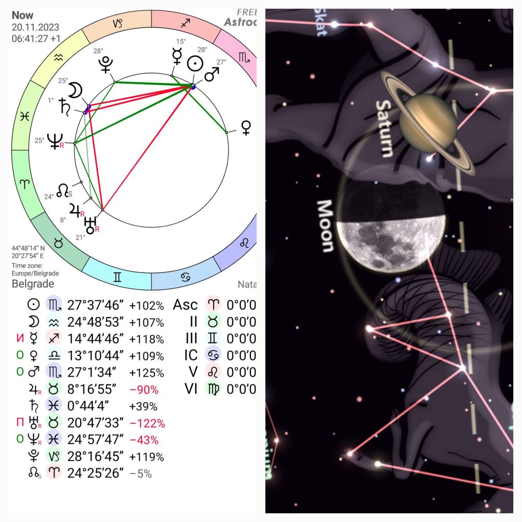 Ponedeljak,20.11.2023,Mesečev dan je svanuo u 06:41:27 sa Suncem na 28°Škorpiona.Sunce se odvaja od Marsa ide u lep aspekt sa Plutonom.