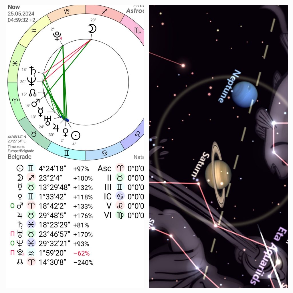 Subota 25.5.2024 Saturnov dan je svanuo u 04:59:32 sa Suncem na 4°24′ Blizanaca.
