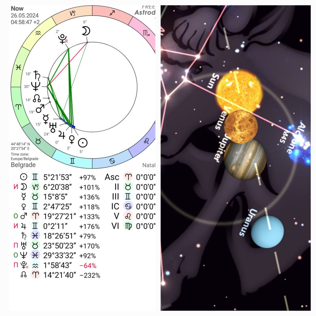 prilagođavanja, jer Sunce u Blizancima je u društvu sa Venerom i Jupiterom i oni šire lepršaji komuniciraju dok je Mesec u Jarcu, zatvoren, odmeren hladan kontemplira.To vam je kao udah i izdah.