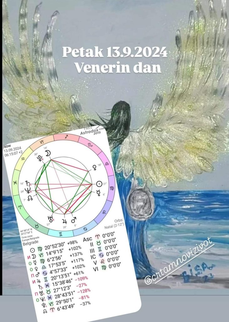 Petak 13.9.2024 Venerin dan je svanuo u 06:15:07 sa Suncem na 21°Device.U hrišćanstvu, broj 13 se povezuje sa Poslednjom večerom, gde je Juda, trinaesti gost, izdao Isusa. Taj događaj se smatra jednim od najpoznatijih simbola nesreće vezanih za broj 13.U mnogim kulturama broj 12 se smatra potpunim (12 meseci u godini, 12 apostola, 12 bogova Olimpa), dok broj 13 prelazi tu harmoniju i donosi nesklad.Petak se smatra nesrećnim danom jer je, prema verovanju, Isus Hristos razapet na Veliki petak. Takođe, u nekim kulturama, petak je dan kada su se događali značajni loši događaji.Kombinacija ova dva straha stvorila je moderni mit o petku 13. kao posebno nesrećnom danu. U popularnoj kulturi, ovo verovanje se dodatno učvrstilo kroz filmove, knjige i priče, čineći ga univerzalnim simbolom za baksuzluk???Venera vladarka dana je na 18°Vage.Kada Venera prolazi kroz znak Vage u tranzitu, njen uticaj naglašava harmoniju, odnose i estetiku. Venera je prirodni vladar Vage, pa se u ovom znaku oseća vrlo snažno i u svom elementu, što donosi pozitivne efekte na teme koje ona simbolizuje.Vaga je znak partnerstva, pa je ovaj tranzit često period kada se stavlja akcenat na odnose, bilo da su u pitanju romantični, prijateljski ili poslovni. Ljudi su skloni tražiti balans i sklad u interakcijama s drugima. Sve u svemu, ovaj tranzit donosi mogućnosti za poboljšanje odnosa, uživanje u lepoti i kreiranje harmoničnih iskustava u različitim sferama života.Vaga je povezana s pravdom i ravnotežom, pa je zahvalnost važan aspekt buđenja njene energije.Nađite mesto na kojem se osećate smireno. Ponesite dnevnik ili papir i olovku.Napišite sve za šta ste zahvalni u svom životu – od malih stvari do većih aspekata poput odnosa ili prilika koje su vam pružene. Osetite balans koji zahvalnost donosi u vaš život.Završite ritual tako što ćete se fokusirati na vraćanje harmonije u područja u kojima osećate disbalans.Prođite svojim udahom od stopala do temena i dugo izdahnite u lakoći.