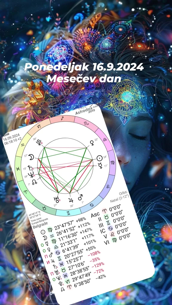 Ponedeljak 16.9.2024 Mesečev dan je svanuo 06:18:10 sa Suncem na 23°Device.