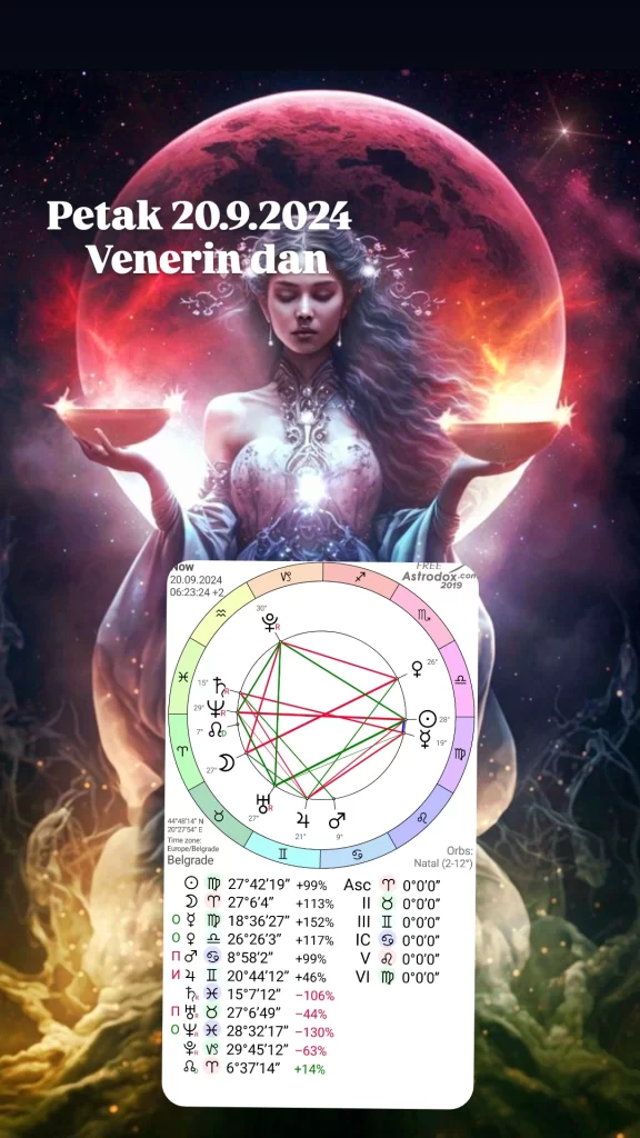 Petak 20.9.2024 Venerin dan je svanuo u 06:23:24 sa Suncem na 28°Device.