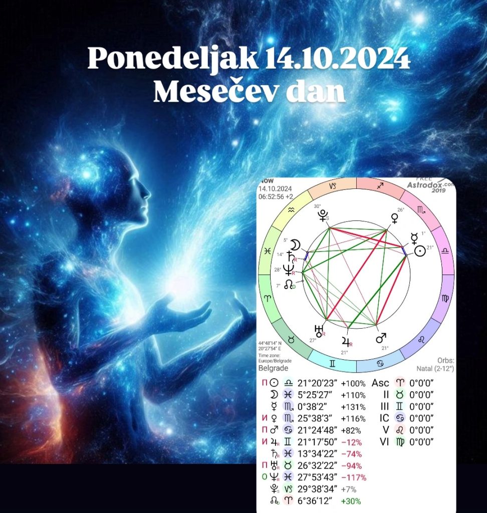 Ponedeljak 14.10.2024 Mesečev dan je svanuo 06:52:56 sa Suncem na 21°Vage.