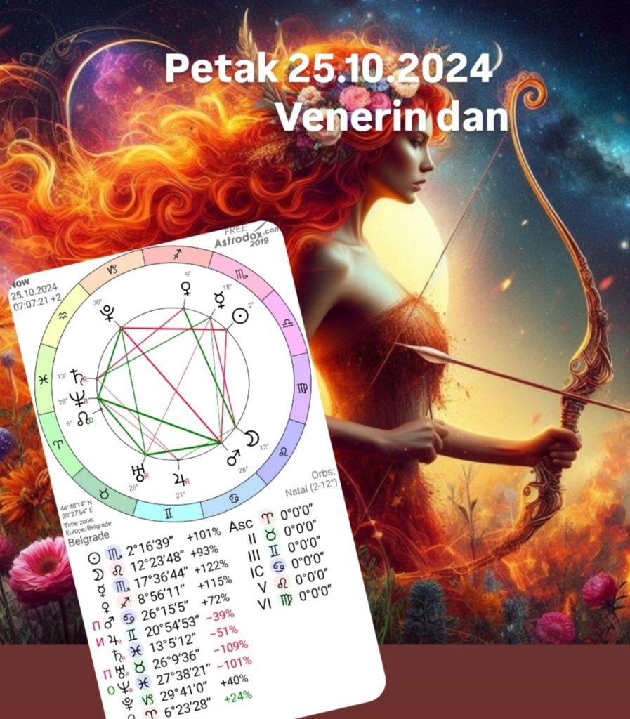 Petak 25.10.2024 Venerin dan je svanuo u 07:07:21 sa Suncem na 2°Škorpiona.