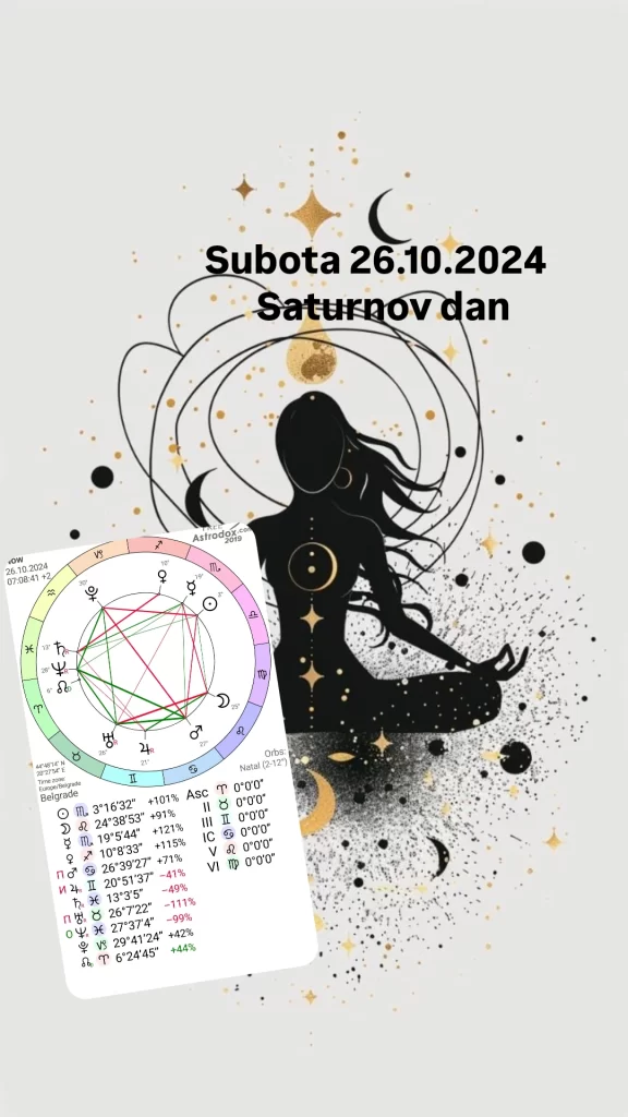 Subota 26.10.2024 Saturnov dan je svanuo u 07:08:41 sa Suncem na 3°Škorpiona.Veoma posebno mesto u zodijaku gde se susreće duša i smrt ili transformacija.Ovo je mesto isceljenja ( iscelitelja)