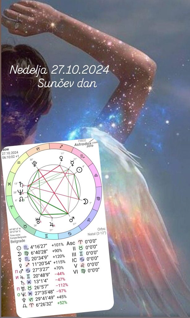 Nedelja 27.10.2024 Sunčev dan je svanuo u 06:10:02 sa Suncem na 4°Škorpiona.