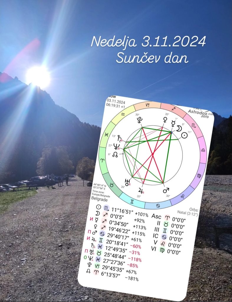Nedelja 3.11.2024 Sunčev dan je svanuo u 06:19:31 sa Suncem na 11°Škorpiona.