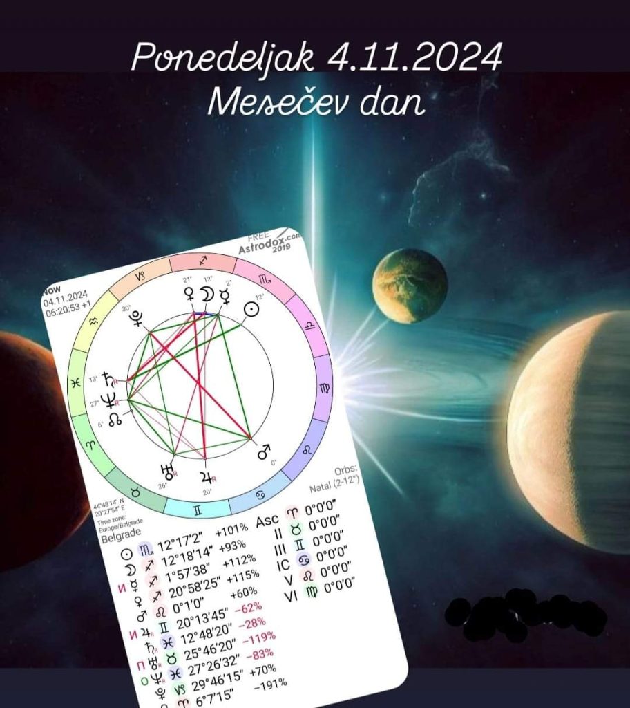 Ponedeljak 4.11.2024 Mesečev dan je svanuo u 06:20:53 sa Suncem na 12°Škorpipna u trigonu sa Saturnom iz Riba.