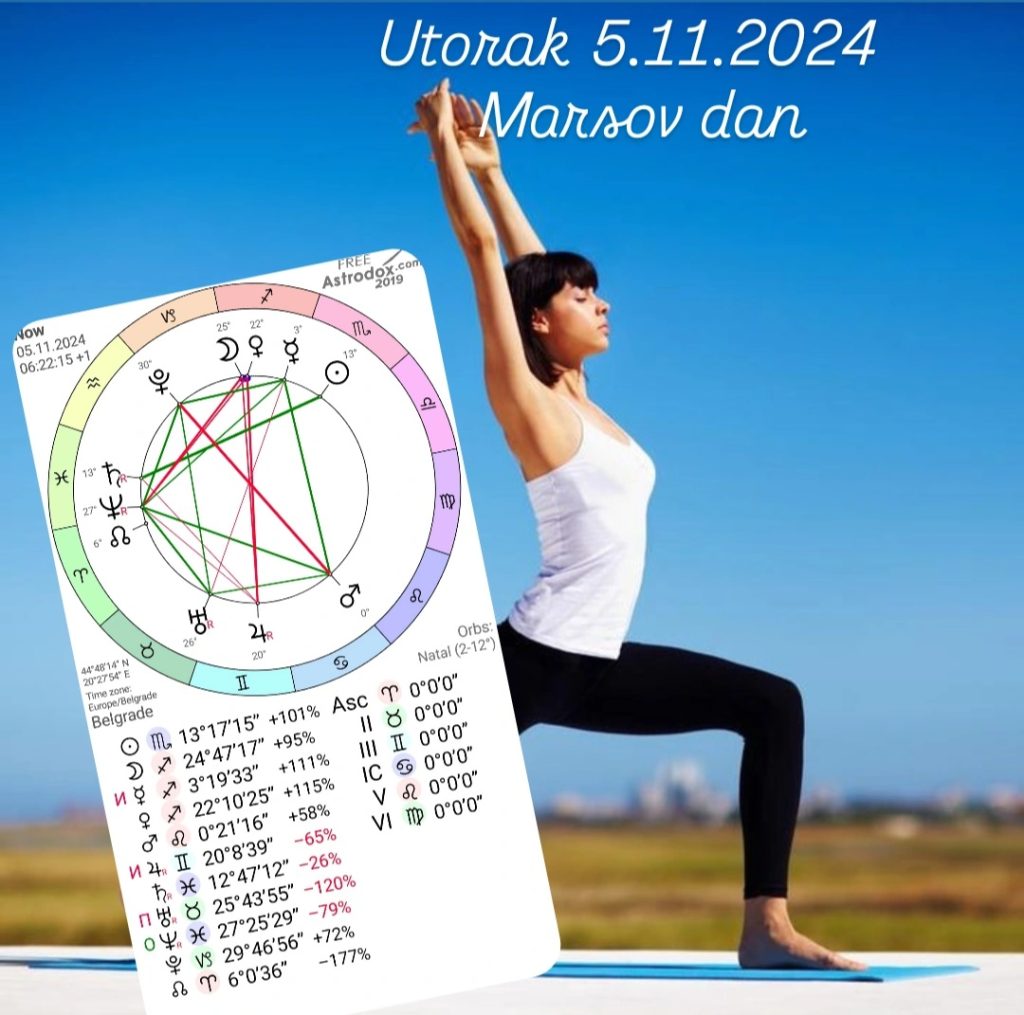 Utorak 5.11.2024 Marsov dan je svanuo u 06:22:15 sa Suncem na 13°Škorpiona.Dispozitor Sunca Mars je promenio znak, iz emotivnog Raka je prešao u samouverenog Lava.
