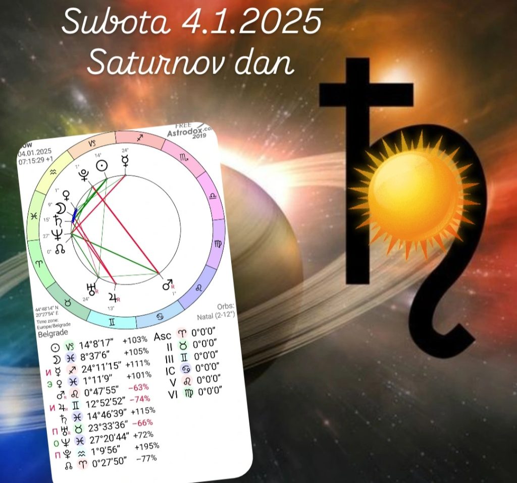 Subota 4.1.2025 Saturnov dan je svanuo u 07:15:29 sa Suncem na 14°Jarca sa energijom stabilnosti i introspekcije, ali i određenim izazovima koji pozivaju na unutrašnje balansiranje.