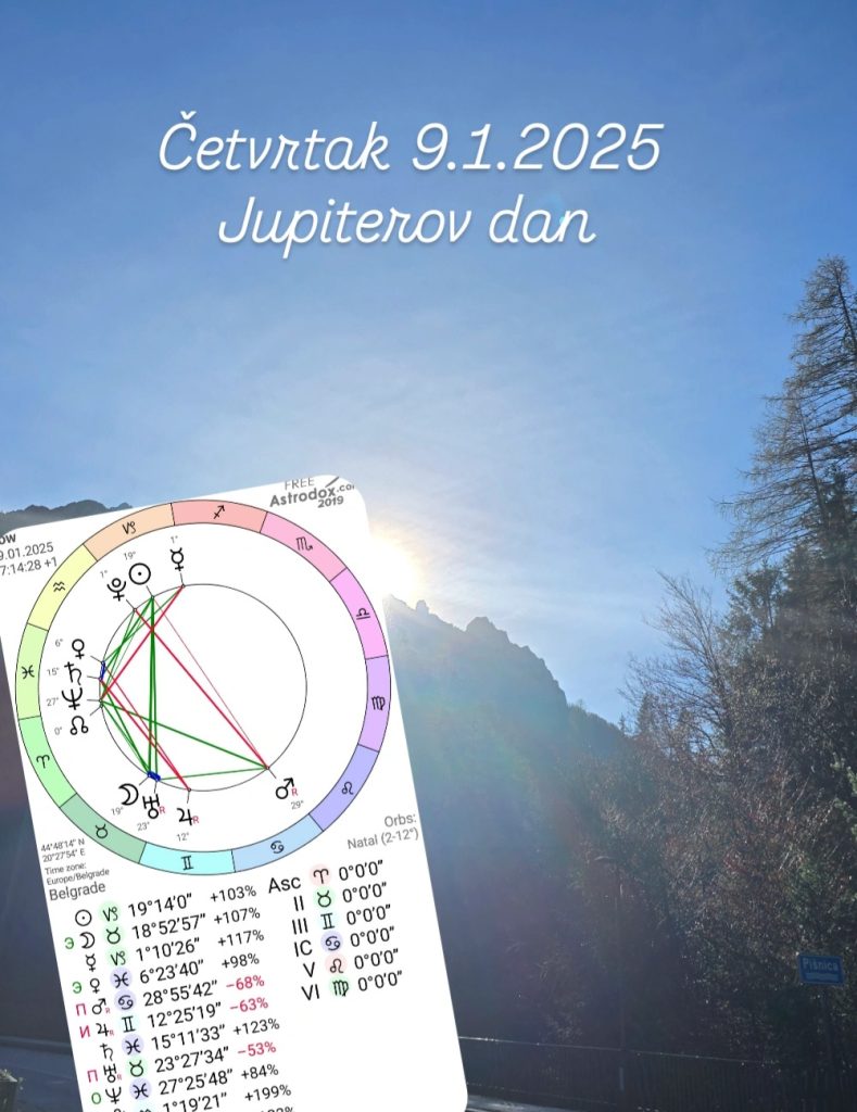 Četvrtak 9.1.2025, Jupitrov dan je svanuo u 07:14:28 sa Suncem na 19°Jarca, koji ima divan odnos sa Mesecom na 19°Bika.