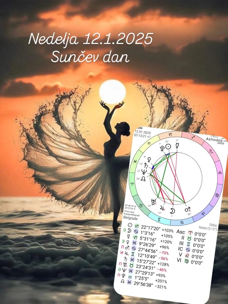 Nedelja 12.1.2025 Sunčev dan je svanuo u 07:13:20 sa Suncem na 22°Jarca.I bez obzira što je danas Sunčev dan, Mesec je u zoru prešao u znak Raka ide u pun Mesec koji će biti sutra kasnim satima pred ponoć.