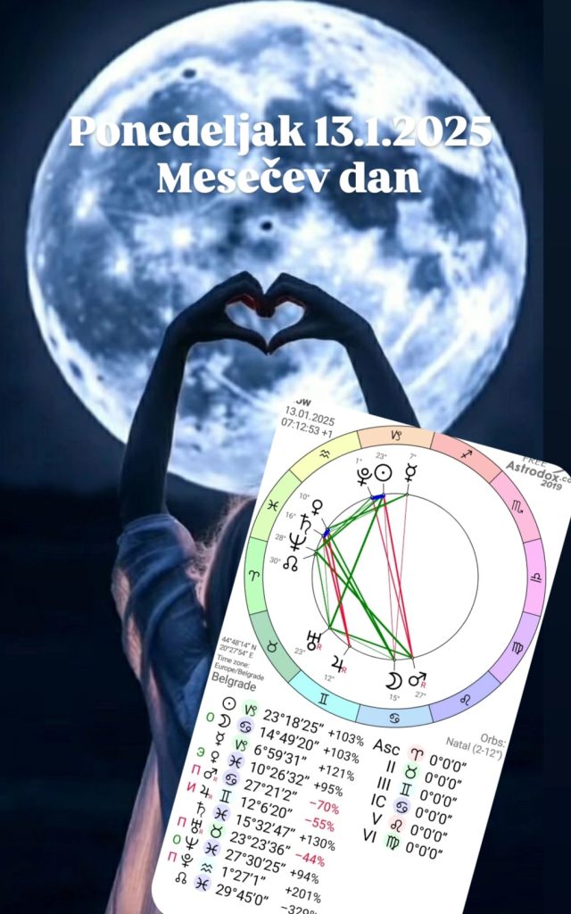Ponedeljak 13.1.2025 Mesečev dan je svanuo 07:12:53 sa Suncem na 23°Jarca.