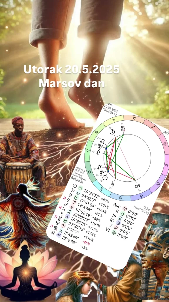 Sunce izlazi u 05:04:04, a dan otvara 29. stepen Bika, karmički i završni stepen jednog zemaljskog ciklusa. Na pragu smo promene — u 21h Sunce ulazi u znak Blizanaca, donoseći vetar pokreta, razmene, lakoće i znatiželje.