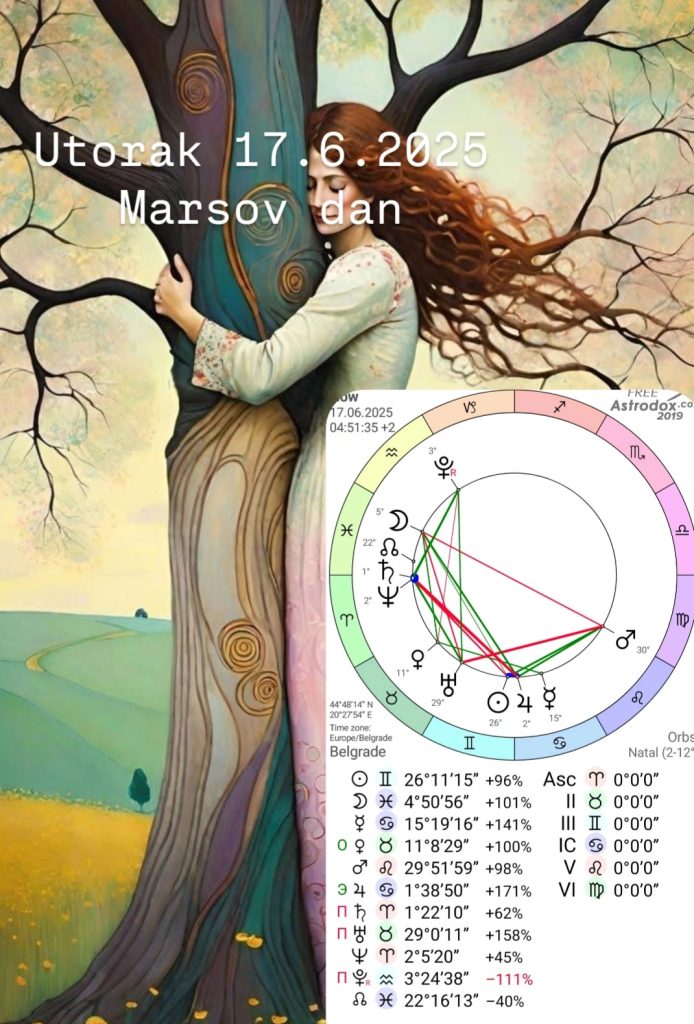 Danas je dan kada vatra i zemlja menjaju dinamiku sveta. Mars — arhetip pokretača, ratnika i snage volje — nalazi se na 29°52′ Lava, poslednjem stepenu ove kraljevske, ponosne i izrazito subjektivne energije. Ovaj stepen u astrologiji zovemo anaretički, krizni stepen, jer sabira sve iskustvo prethodnog znaka i traži konačnu odluku, ishod, kulminaciju.