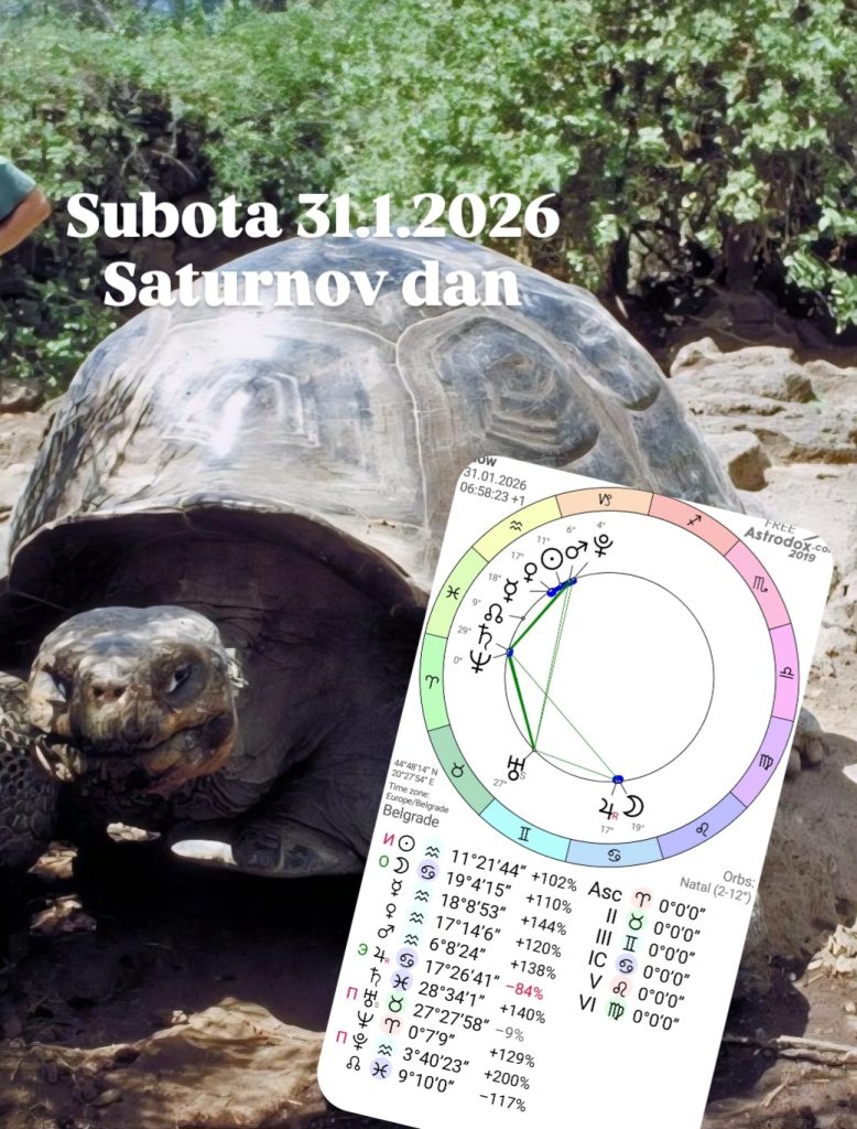 Subota, 31.1.2026 — Saturnov dan, završni prag januara, otvara se u 06:58:23 sa Suncem na 11° Vodolije. Dan nosi pečat unutrašnje ozbiljnosti, zrelosti i odgovornog uvida. Saturnov kvalitet vremena traži strukturu, jasnoću i svesno upravljanje energijom — ne kroz pritisak, već kroz izbor zrelog odgovora na ono što se budi u kolektivnom i ličnom polju.