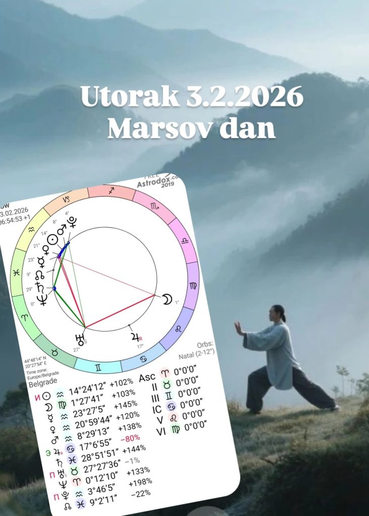 Marsov dan svanuo je u 06:54:53, sa Suncem na 14° Vodolije, okružen snažnom, ali suptilnom ekipom planeta. Sunce je u društvu Plutona, Marsa, Venere i Merkura, ali energija se danas više odvija ispod površine nego kroz konkretne događaje.