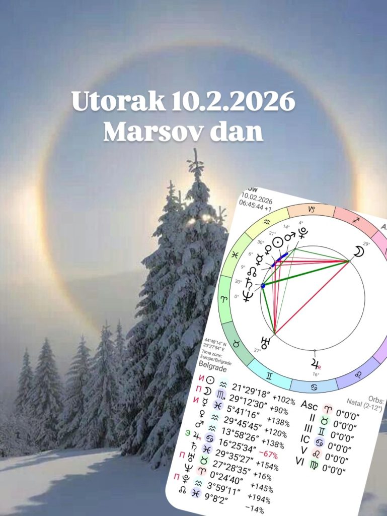 Utorak, 10. februar 2026 – Marsov dan je svanuo u 06:45:44, sa Suncem na 21° Vodolije, na stepenu egzaltacije Neptuna. Ovo je snažna pozicija koja osvetljava ono što je bilo zamagljeno, skriveno ili svesno potiskivano. Sunčeva svetlost danas ima moć da razotkrije obmane, laži, manipulacije i iluzije – ne kroz dramatične događaje, već kroz unutrašnje uvide i nagla buđenja svesti.