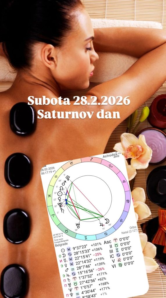 Subota, 28. februar 2026 — Saturnov dan svanuo je u 06:17:19 sa Suncem na 9°37’ znaka Riba — u prostoru gde se završava jedan ciklus i gde duša polako zatvara vrata prošlosti kako bi se pripremila za novo rađanje.