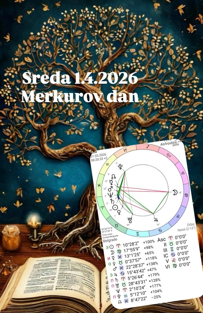 Sreda, 1. april 2026. – Merkurov dan buđenja svesti svanuo je u 06:18:42, sa Suncem na 11°27′ znaka Ovna. U ovom vatrenom prostoru početka i pokreta nalaze se i Saturn, Neptun i Kiron – čitav jedan unutrašnji univerzum koji traži da se pokrene, ali ne impulsivno, već svesno.