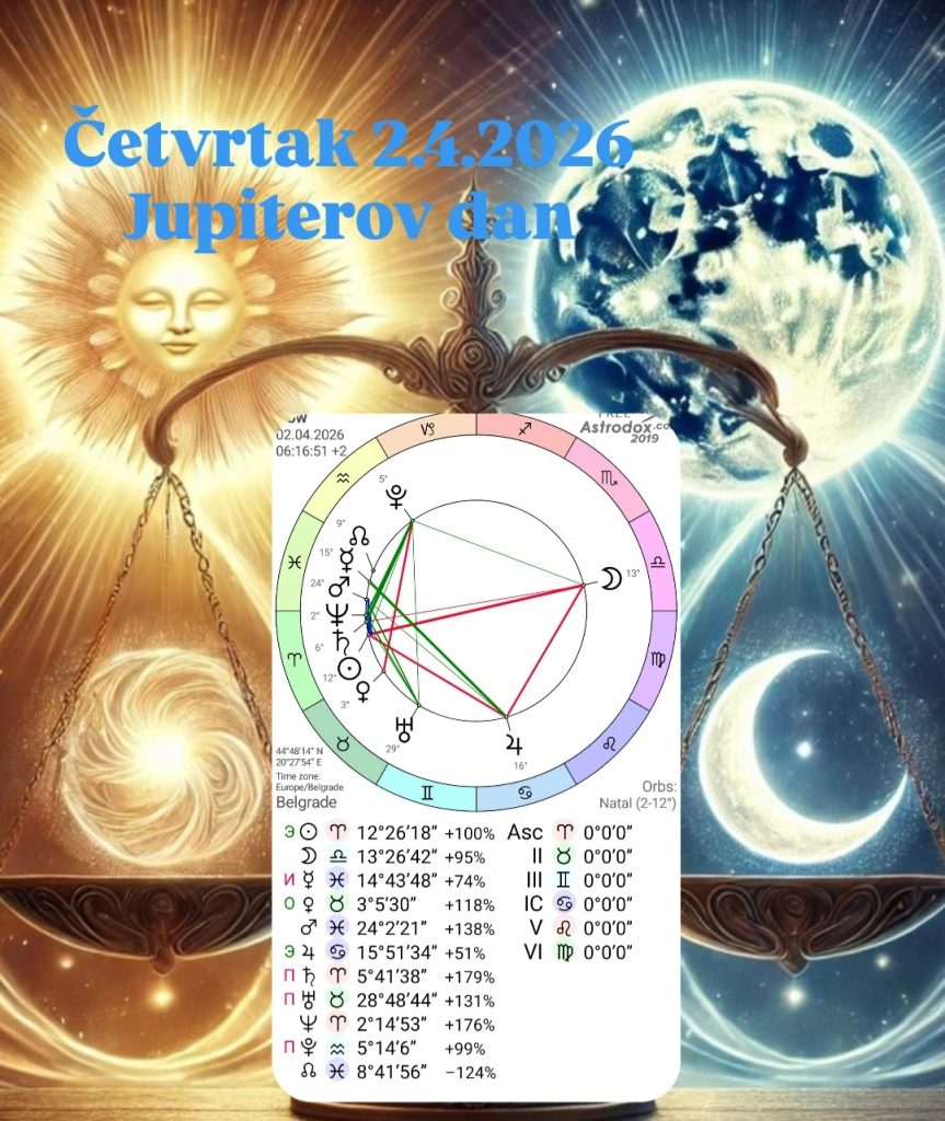 Četvrtak, 2. april 2026.Jupiterov dan svanuo je u 06:16:51 sa Suncem na 12°26′ znaka Ovna, u snažnom stelijumu sa Neptunom, Saturnom i Kironom. Ovo je nebo koje istovremeno pokreće, ali i traži duboko razumevanje – spoj inicijacije i isceljenja, akcije i predaje višem smislu.
