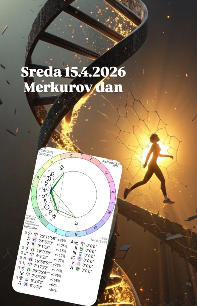 Sreda, 15. april 2026. – Merkurov dan započinje u 05:53:30 sa Suncem na 25° Ovna.